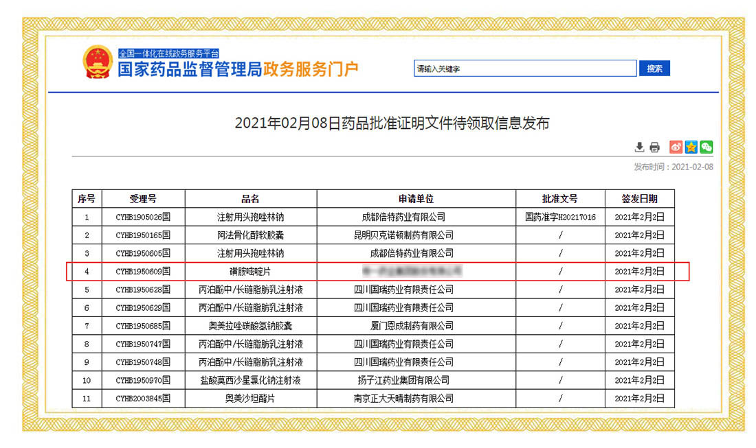 2021年2月2日,国家药品监督管理局正式发布通知,新黄金城hjc222医药接受委托申报的磺胺嘧啶片正式通过仿制药质量和疗效一致性评价。同时,这也是国内首家通过磺胺嘧啶片的企业。